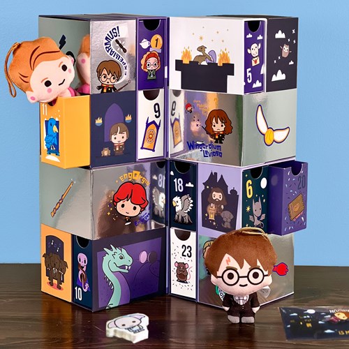 En stor kalender för alla Harry Potter-fans med roliga små figurer, leksaker och pyssel! Kalendern är byggd som ett torn i fyra våningar med gömda utdragbara lådor. Genom att veckla upp kalendern hittar du fler och fler gömda överraskningar!