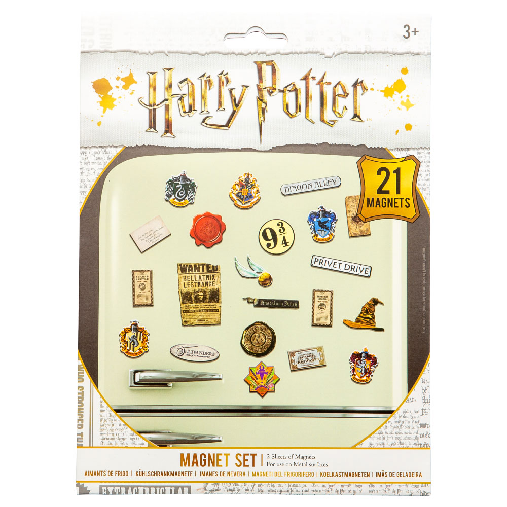 Harry Potter Magneter omfattar 21 st kylskåpsmagneter med olika motiv från Harry Potter. Magneterna kan fästas på magnetiska metalliska ytor.