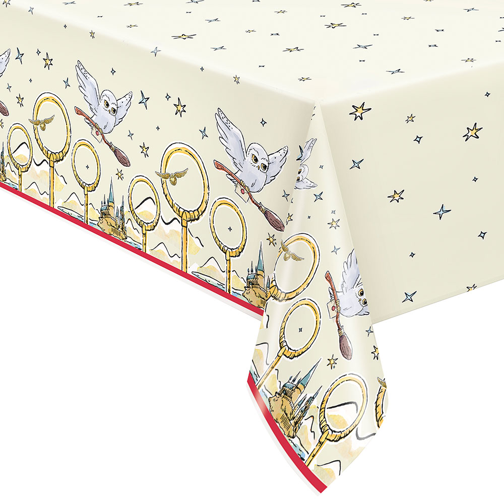 Harry Potter Pappersduk omfattar en ljusgul bordsduk i papper med motiv från Harry Potters värld. Motiven är i form av ugglan Hedwig, Hogwarts byggnaden och Quidditch planen samt små stjärnor. Duken är ca 1,37 x 2,13 meter.