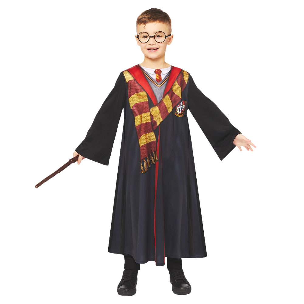 Harry Potter Utklädnad Barn omfattar en officiellt licensierad Harry Potter maskeraddräkt för barn som består av en svart rock med huva och fotorealistiskt motiv av en halsduk och en skjorta med slips samt ett Gryffindor märke på bröstet. Dräkten är tillverkad av polyestermaterial och kommer även med ett par svarta glasögon och en trollstav av plast.