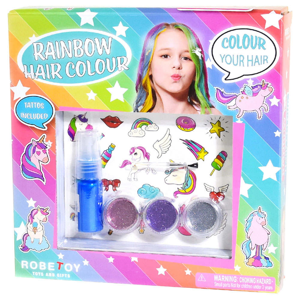 Drömmer du om ett färgglatt och snyggt glittrande hår så kan detta roliga hårsprayset göra din dröm till verklighet! Med en snygg hårspray med blå färg, massor av fint glitter och häftiga hår-tatueringar kan du styla håret riktigt snyggt på bara några korta minuter. Ett helkul hårspray set för barn som passar lika bra till kalas som till lek.