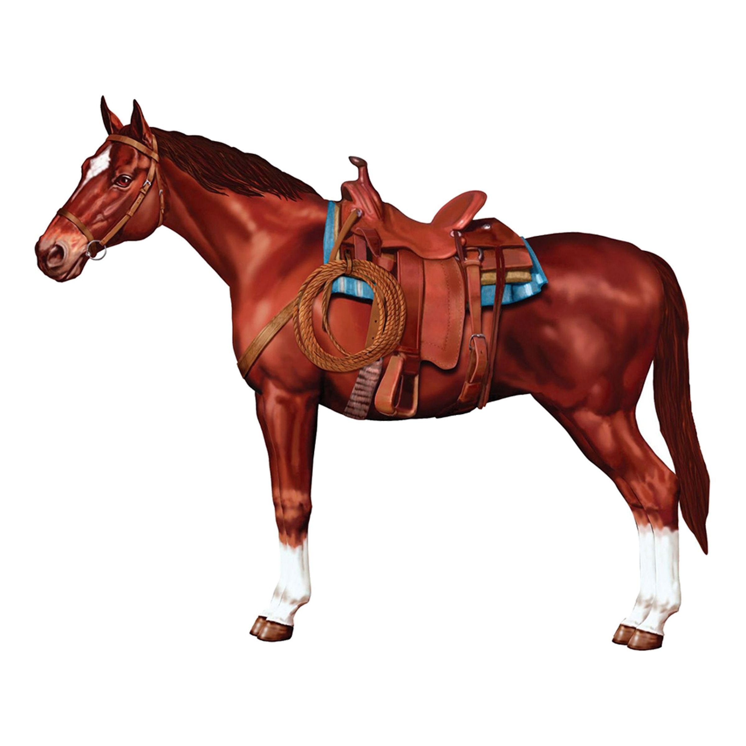 Häst Dekoration i Papp är en figur i hårdpapp formad som en ståtlig brun häst med sadel. Figuren är ca 96 cm stor. Levereras omonterad.