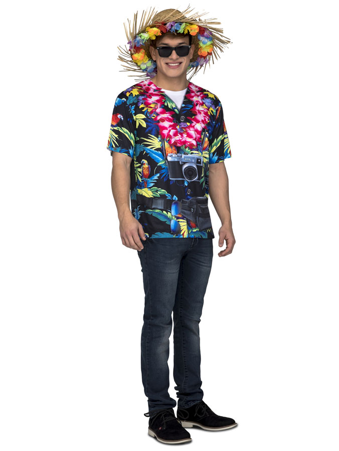 Hawaiian Fotorealistisk T-shirt innehåller en fotorealistisk t-shirt med tryckt motiv av en Hawaii skjorta med vit tröja under, en rosa blomsterkrans och en kamera runt halsen, samt en svart magväska.