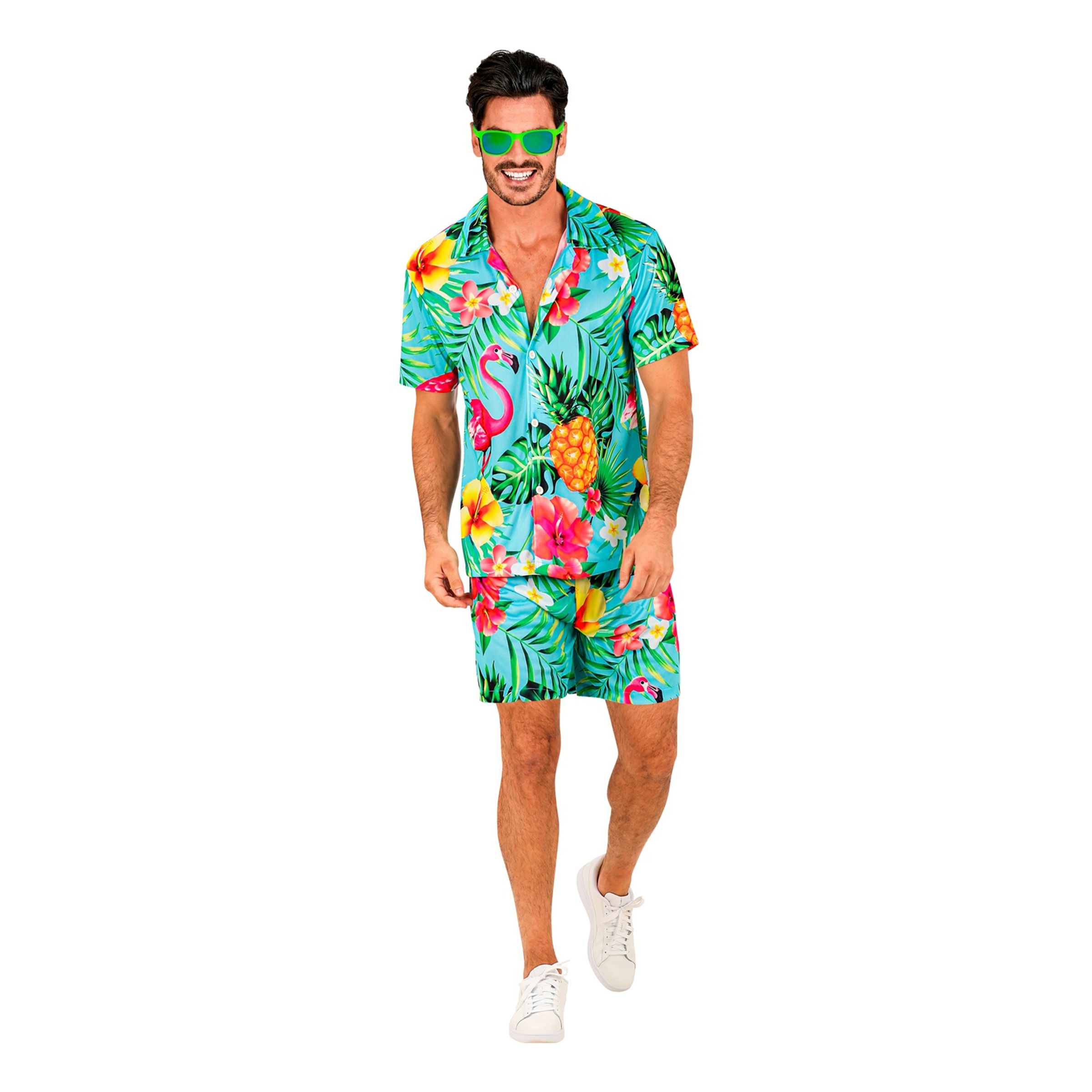 Hawaiidräkt Turkos inkluderar en kortärmad skjorta och ett par matchande shorts i turkost med motiv av blommor och blad. En snygg dräkt att bära på sommarfesten eller partyt med hawaiitema!