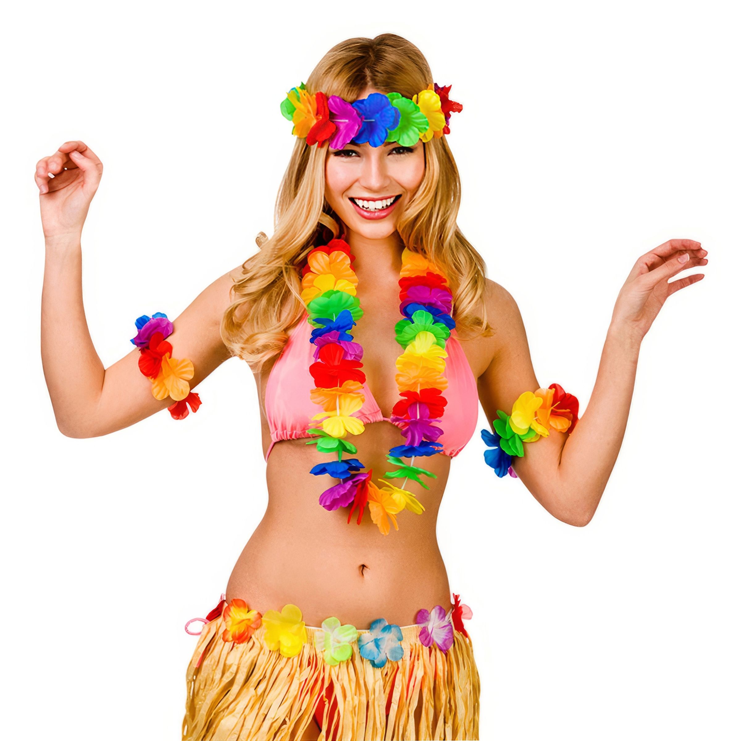 Kombinera detta kit med en hawaiiansk gräskjol så har du en komplett outfit för hawaiifesten! Kransarna har underbara färger som verkligen fullbordar Hawaii-looken!