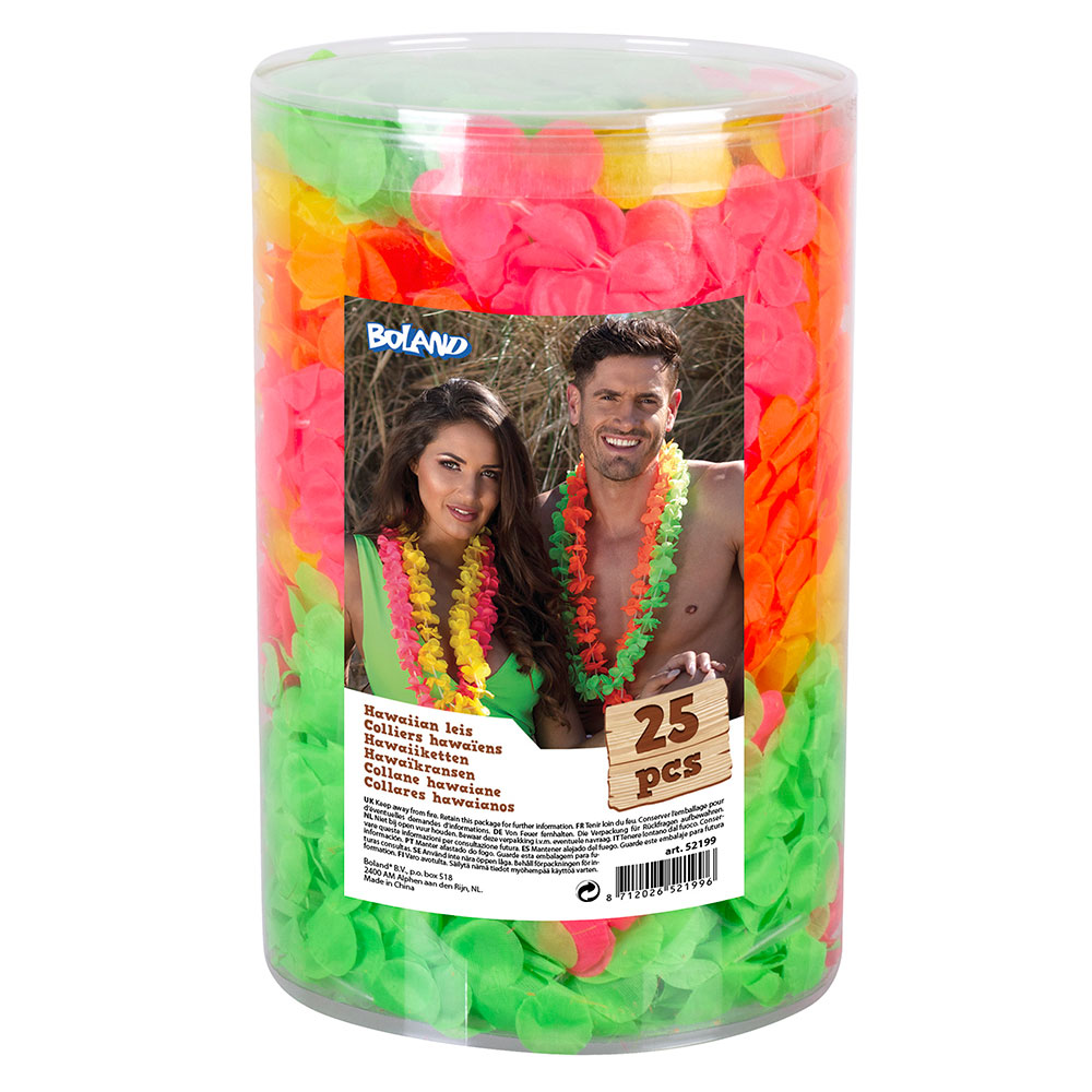 Hawaiikransar Flera Färger 25-pack omfattar 25 stycken Hawaii halsband med blommor i rosa, orange, gult och grönt.