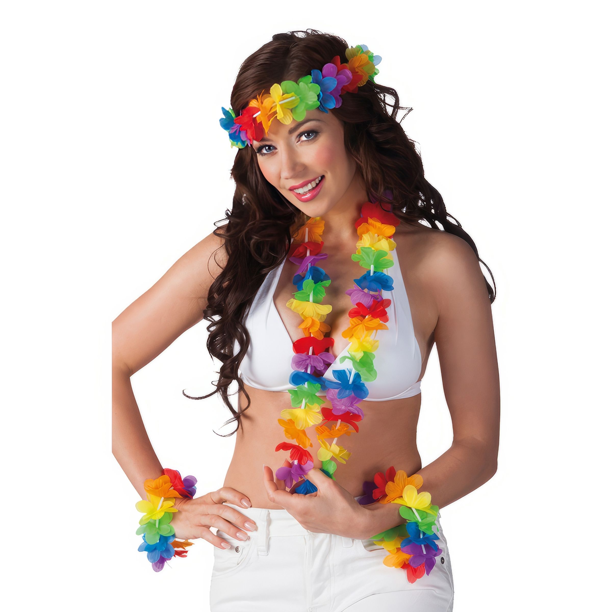Hawaiiset Regnbågsfärgat inkluderar fyra blomsterkransar i polyester. En huvudkrans, två handledskransar samt en stor krans som du hänger runt halsen. Hawaii kommer att se ut som Moskva i Februari i jämförelse med din tropiska drinkkväll i trädgården.