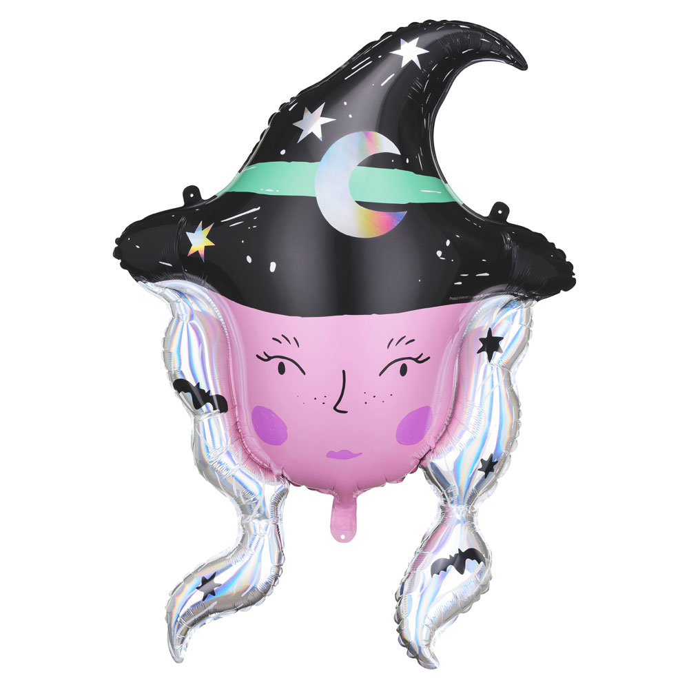 Häxa Folieballong Stor omfattar en folieballong i form av en häxa i rosa med svart hatt med grönt band och holografiska detaljer och långt hår. Ballongen har en ögla på vardera sida om hatten vilket gör att den kan hängas upp på snöre. Ballongen fylls med folie eller helium, blir ca 61,5 x 86,5 cm stor och har självförslutande ventil.