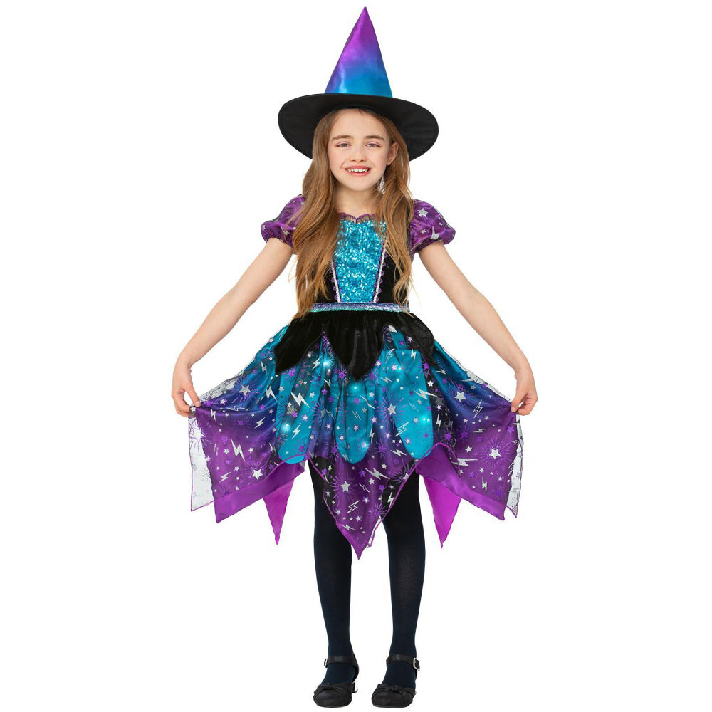 Häxa LED Maskeraddräkt Barn omfattar en barndräkt i svart, blå och lila med vita stjärnor och andra detaljer samt LED-lampor. Dräkten inkluderar en häxhatt och en kortärmad lång klänning med taggiga kanter.