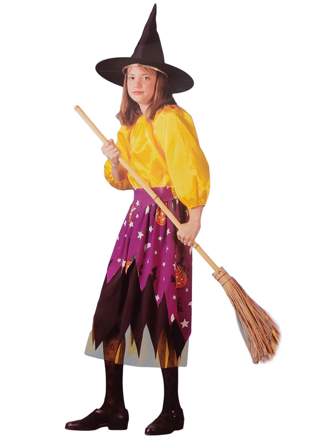 Häxa Maskeraddräkt Barn omfattar en långärmad häxklänning för barn med överdel i gult och underdel i lila och svart med motiv av stjärnor, pumpor och fladdermöss. Klänningen har även gul tyll undertill. Medföljer även en svart häxhatt och ett lila bälte med olika halloween-motiv. Dräkten är tillverkad av polyester och finns i barnstorlekarna Small, Medium och Large.
