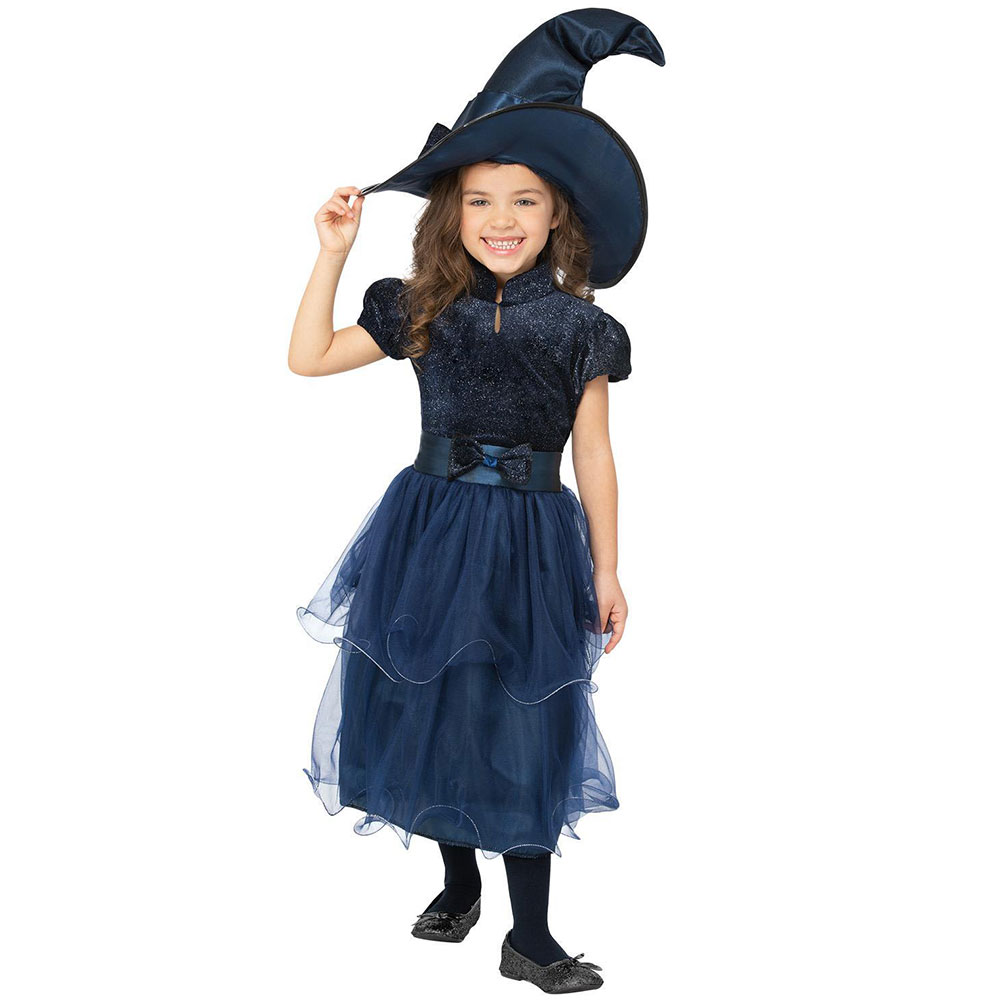 Den mörkblå häxdräkten är perfekt för barn som ska fira Halloween som en magisk häxa. Denna maskeraddräkt kommer med allt som ett barn behöver för att klä ut sig till häxa på Halloween.