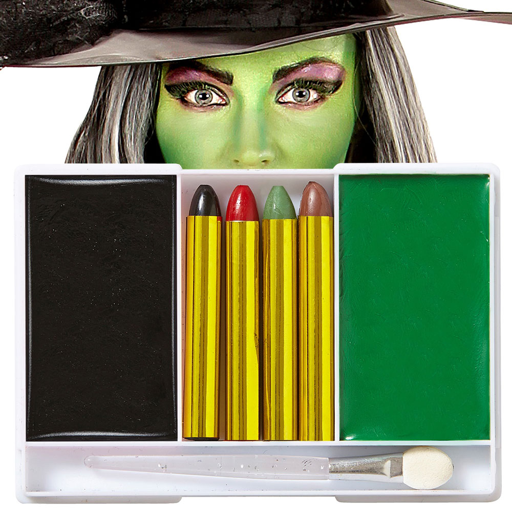Häxa Sminkset omfattar ett sminkset med ansiktssmink, sminkpennor och applikator för att t.ex. måla ett häxansikte.