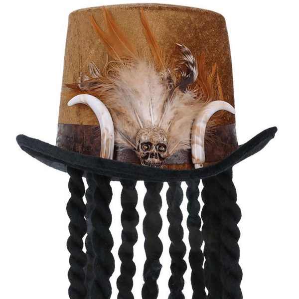 Häxdoktor Hög Hatt med Hår omfattar en brun och svart hög hatt i sammetsliknande material med ett brunt band, en dödskalle och fjädrar framtill samt långa flätor föreställandes hår som sitter fast i hatten.