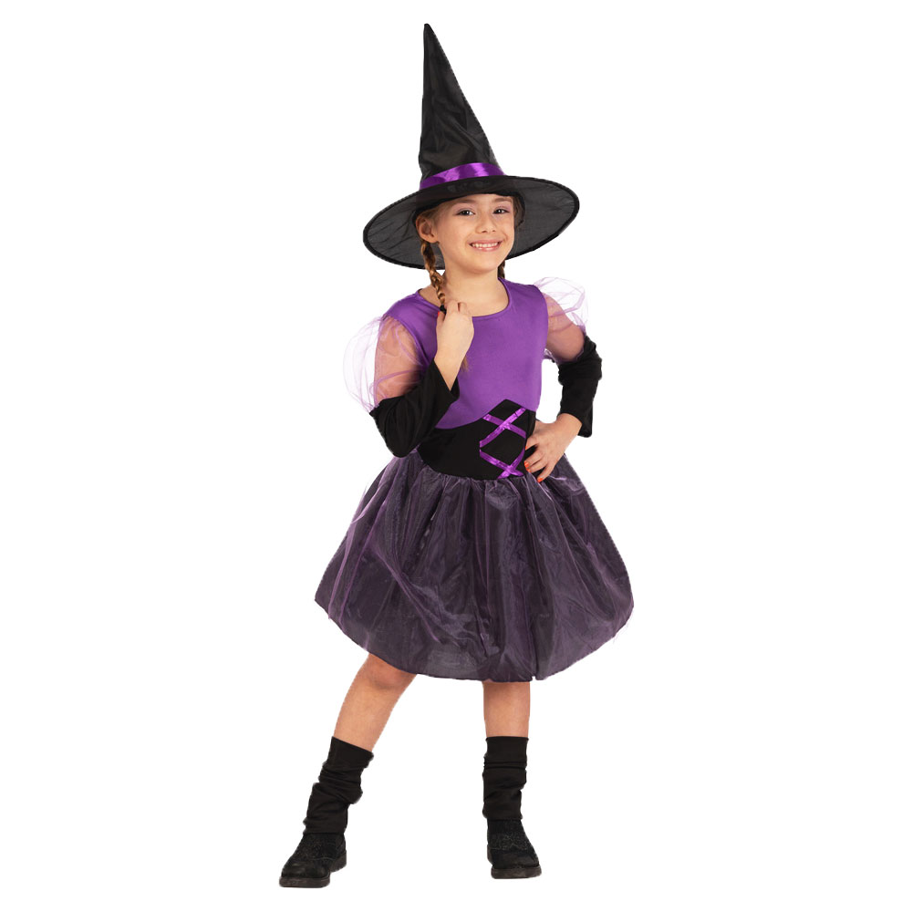Nu kommer tyvärr inte den här dräkten med kraften att förvandla irriterande syskon till grodor, men som tur är finns det många skäl för ett barn att vilja bli en häxa till Halloween-firandet och då är det här helt rätt utklädnad att ha. Med en snygg lila klänning och matchande hatt är häx-kläderna fixade på ett kick inför bus eller godisturen eller Halloween-kalaset.