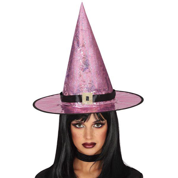 Häxhatt Holografisk Rosa omfattar en häxhatt i ett plastigt material med en rosa holografisk färg och ett svart band med ett guldglittrigt spänne.