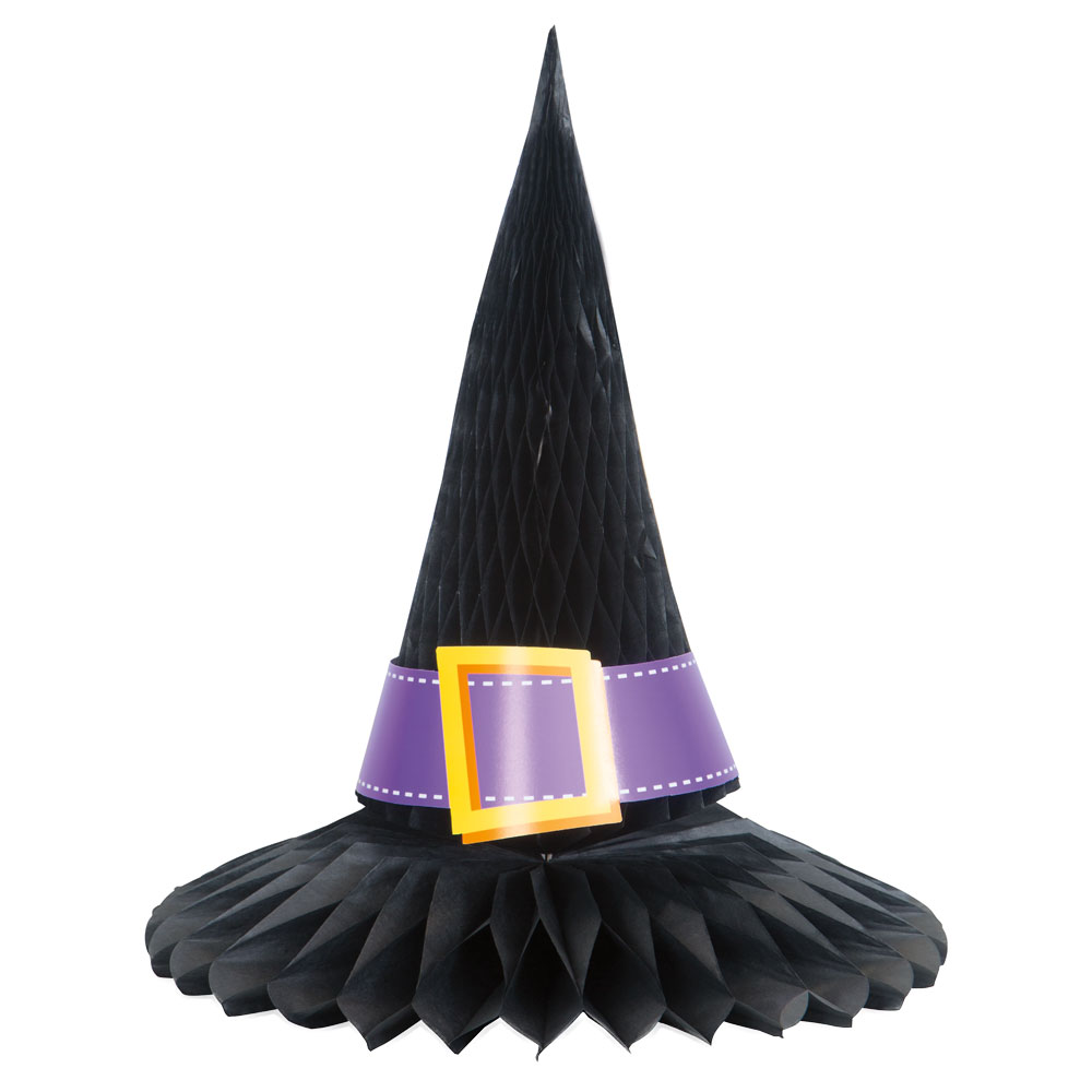 Snygga till din Halloween fest med denna tuffa häxhatt-honeycomb dekoration! En riktigt fin och stämningshöjande bordsdekoration som helt klart livar upp din fest. Ställ häxhatten på bordet som den är eller matcha den med andra kusliga Halloween dekorationer.