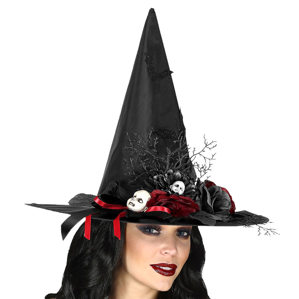 Vill du bli en riktigt stilfull häxa till halloween så är denna maskerad hatt något för dig! Riktigt snygg häxhatt som pryds av rosor, fladdermöss och dockhuvuden som helt klart får din häxa maskerad utklädnad att se extra bra ut. Perfekt för alla häxor som önskar en riktigt snygg klädsel till nästa fest!