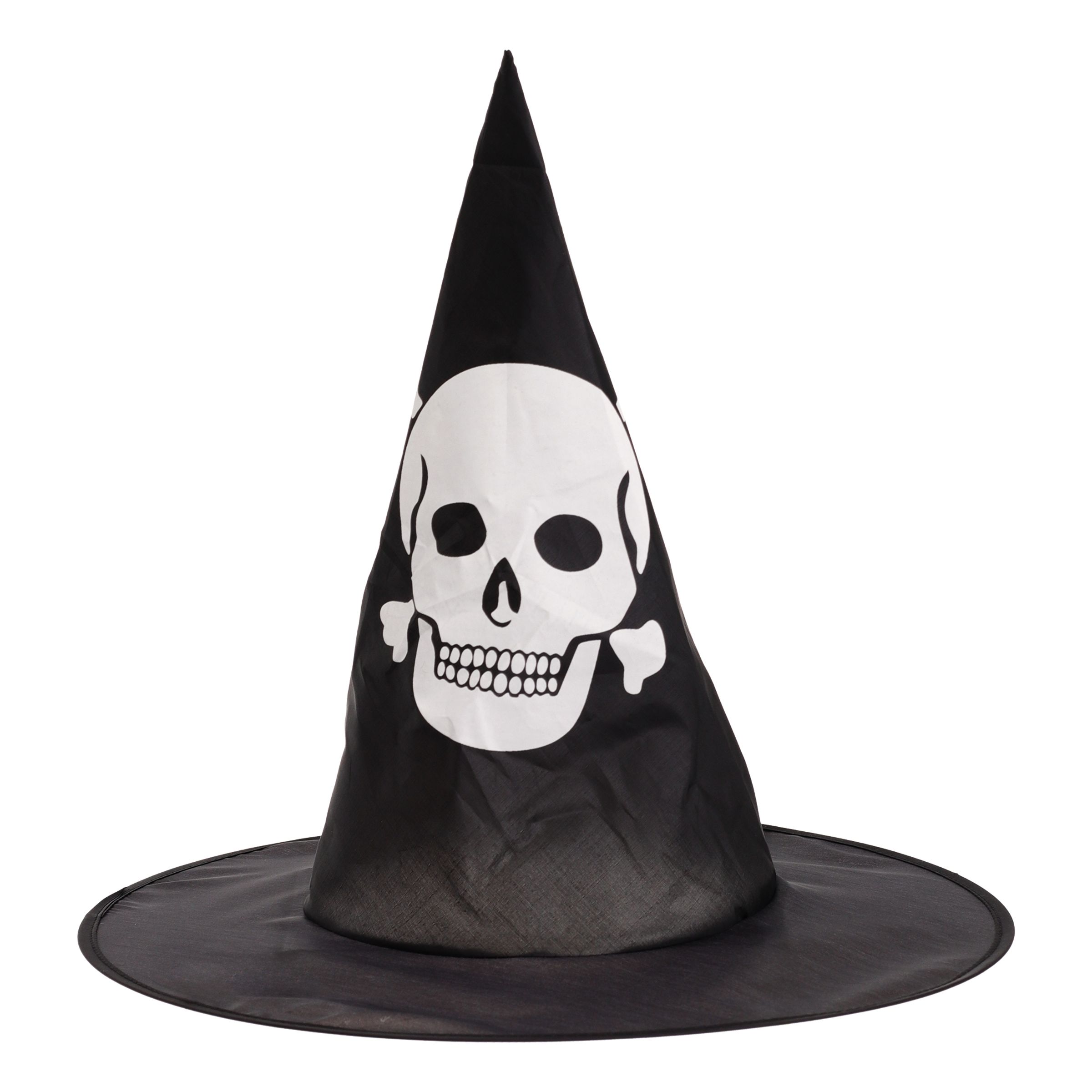 Häxhatt med Dödskalle är en klassisk svart häxhatt med motiv av en dödskalle på. Passar perfekt när du ska klä ut dig till en variant av en häxa på halloween!