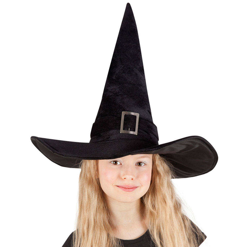 Häxhatt med Stort Silvrigt Spänne Barn omfattar en häxhatt i sammetsliknande svart tyg med ett svart band runt och ett silvrigt spänne på. Kanten av hatten går att forma, då det sitter en ståltråd i.