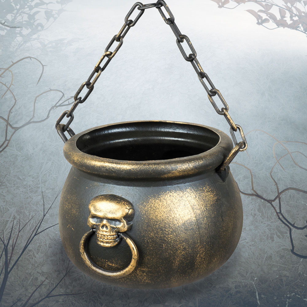 Häxkittel med Döskallar omfattar en kittel i plast med gulddetaljer som du kan samla godis i, den går att bära med en kedja och är dekorerad med döskallar.