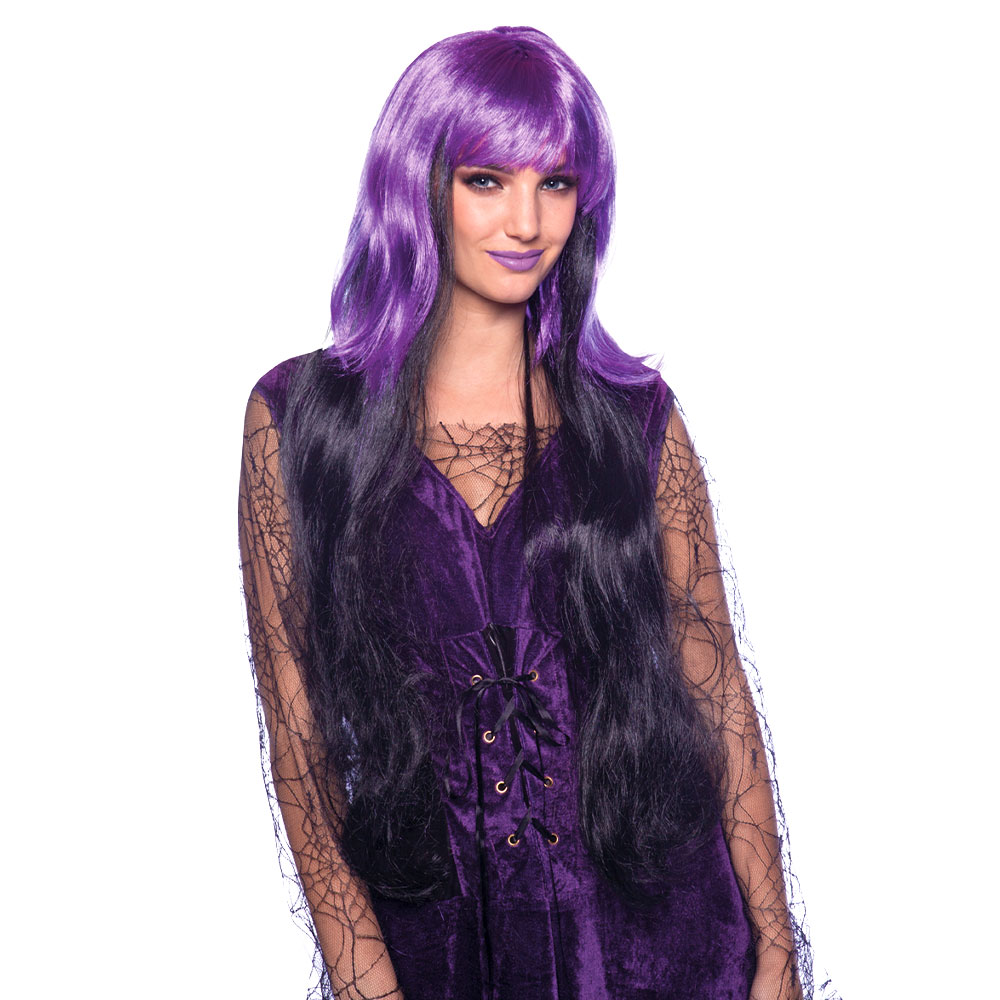 Häxperuk med Lugg Svart och Lila omfattar en lång häxperuk med lugg med kort, lila hår och långt svart hår på längderna. Peruken är tillverkad av polyester och passar vuxna.