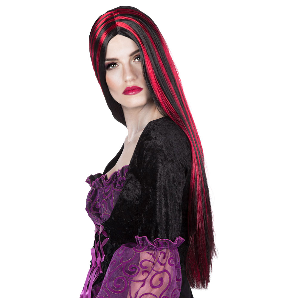 Häxperuk Svart och Röd innehåller en lång rak peruk i svart med röda slingor. Peruken är tillverkad av polyester och passar vuxna.