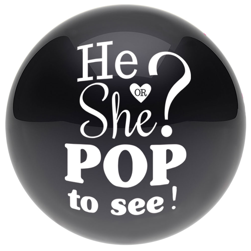 He or She Pop To See Konfettiballong består av en stor, svart latexballong med texten "He or She? Pop To See" i vitt samt en påse rosa konfetti och en påse blå konfetti. Fyll ballongen med rosa eller blå konfetti och blås upp den med luft eller helium. Tillverkad av latex.