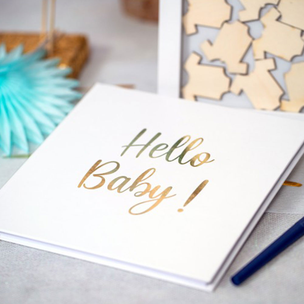 Hello Baby Gästbok omfattar en vit gästbok med baby shower motiv och texten "Hello Baby!" i skimrande guld.