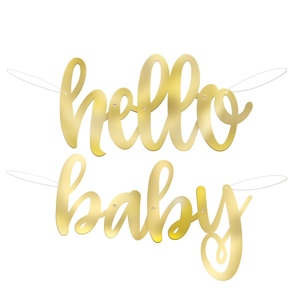 Hello Baby Girlang Guld omfattar en metallic guldig banderoll i två delar som skapar texten "Hello Baby". Fäst bokstäverna i de medföljande snören och fäst upp girlangen mot en vägg, i taket, på ett bord eller liknande.