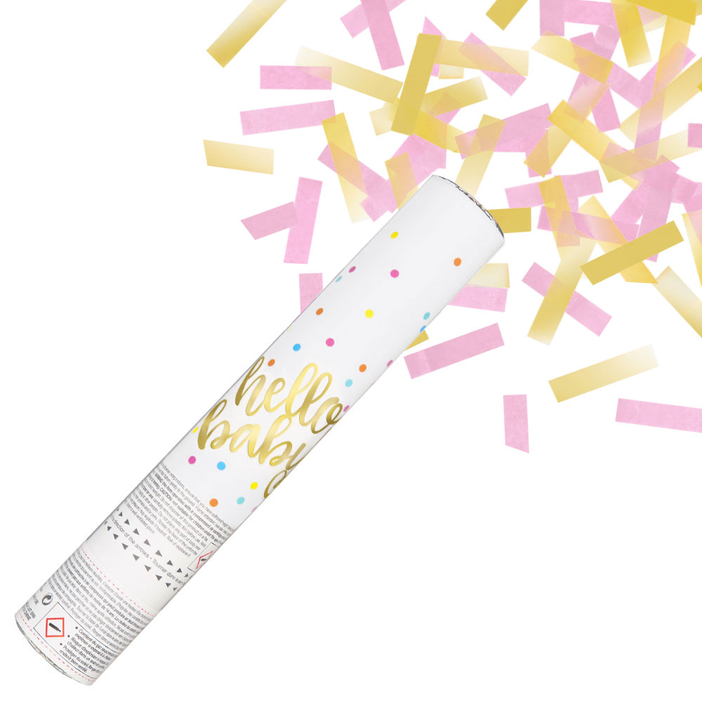 Berätta att det är en flicka med en härlig rosa och guldfärgad konfettiexplosion! Med denna häftiga konfettikanon kan du skapa en riktigt spänningsfylld stämning när det är dags att avslöja bebisens kön, för ihop hela baby shower sällskapet och låt nedräkningen börja. En riktigt häftig baby shower konfettikanon med rosa och guldig konfetti som garanterat blir ett oförglömligt tillbehör till bebisfirandet.