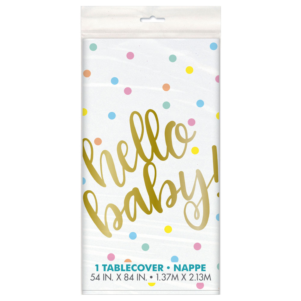 Hello Baby Plastduk innehåller en vit bordsduk med dekorativa prickar i pastellfärger samt texten "Hello Baby" i guld.