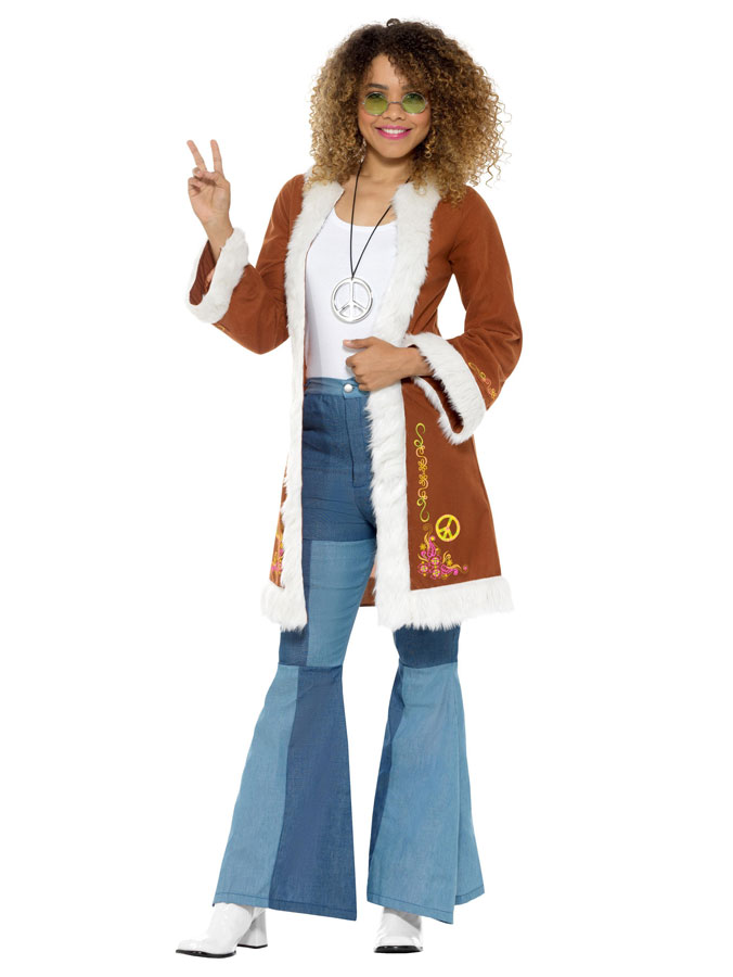 Håll dig varm samtidigt som du blir riktigt hippie snygg med denna tuffa hippie jacka! En riktigt snygg hippie kappa med dekorativt hippiemönster och fuskpäls som garanterat gör din 70-tals maskerad utklädnad helt komplett.