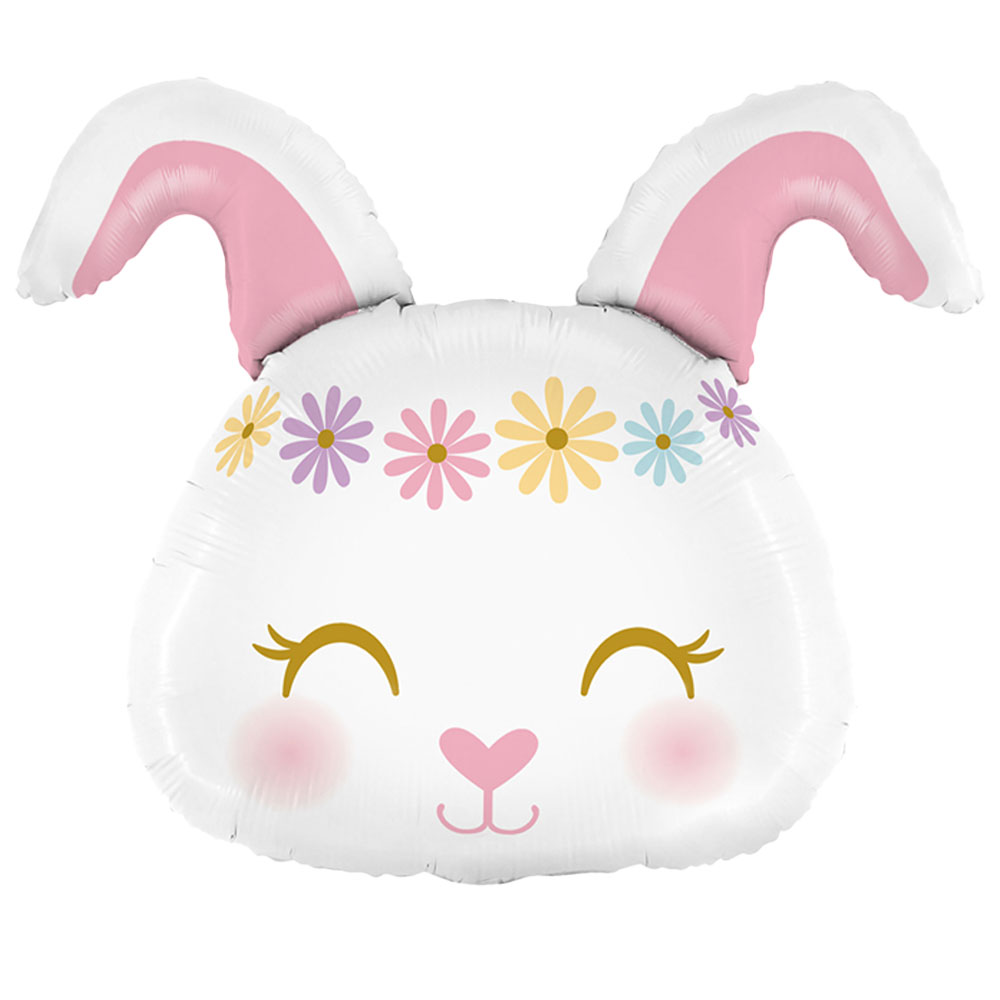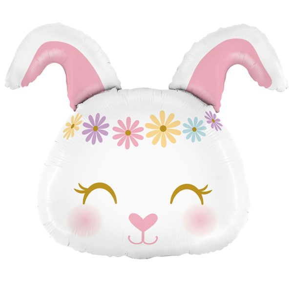 Hippie Kanin Ballong Folie omfattar en folieballong i form av en nöjd kanin med blommor runt ansiktet.