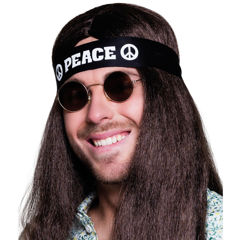 Hippie Pannband Peace är tillverkat av polyester, och omfattar ett svartfärgat pannband med vit tryck av ett par peace-blommor och ordet "Peace".