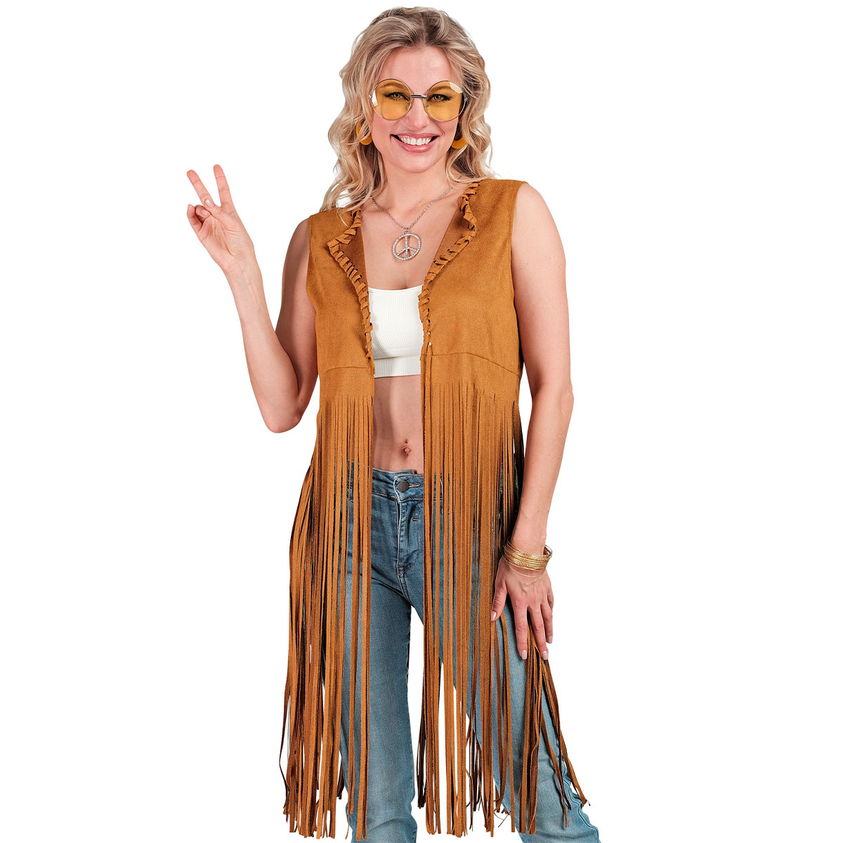 Hippie Väst omfattar en brun fransad väst i hippiestil.