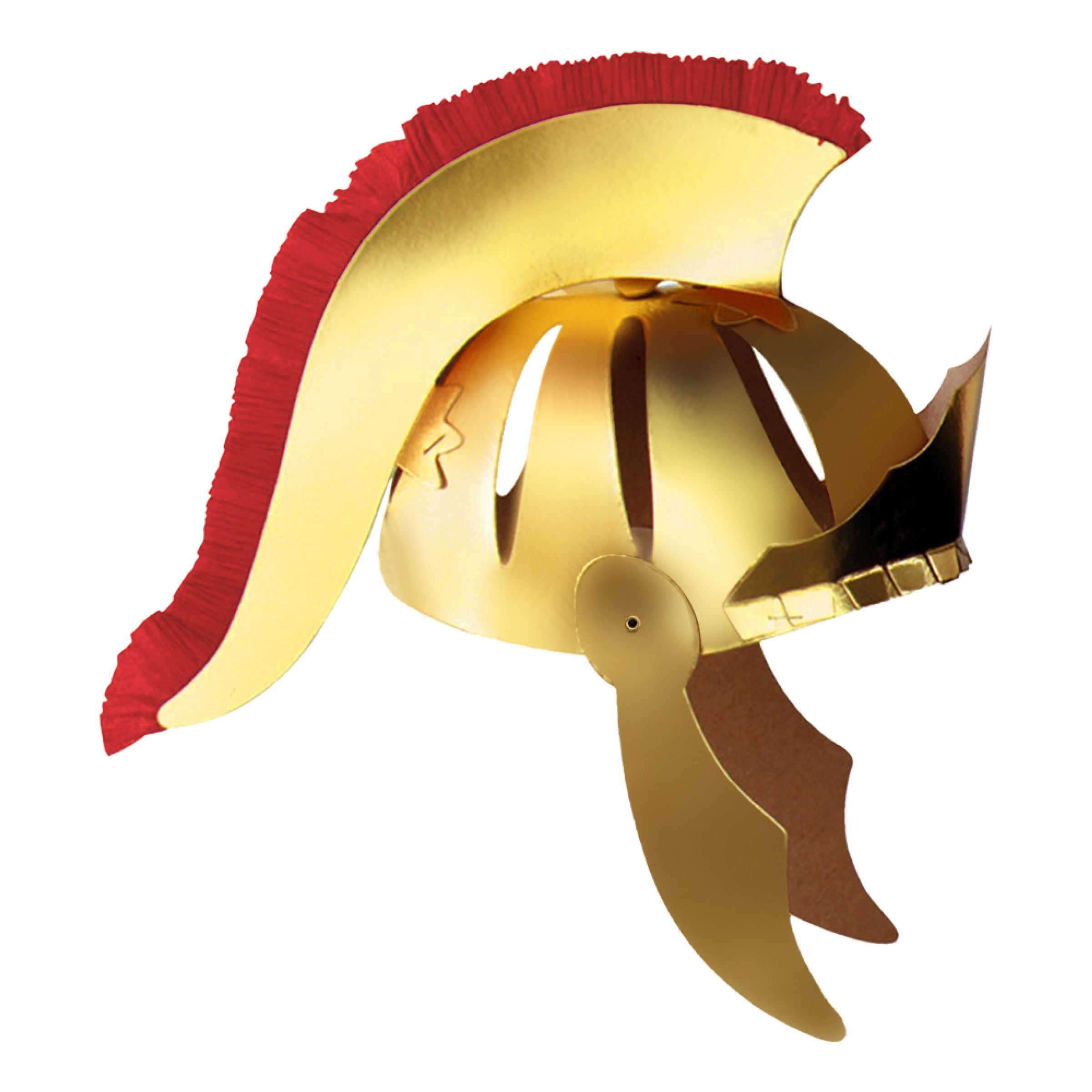 Hjälm Romare Guld är en skimrande guldfärgad papphjälm med röda tygdetaljer i rött, den perfekta maskeradaccessoaren till en krigare!
