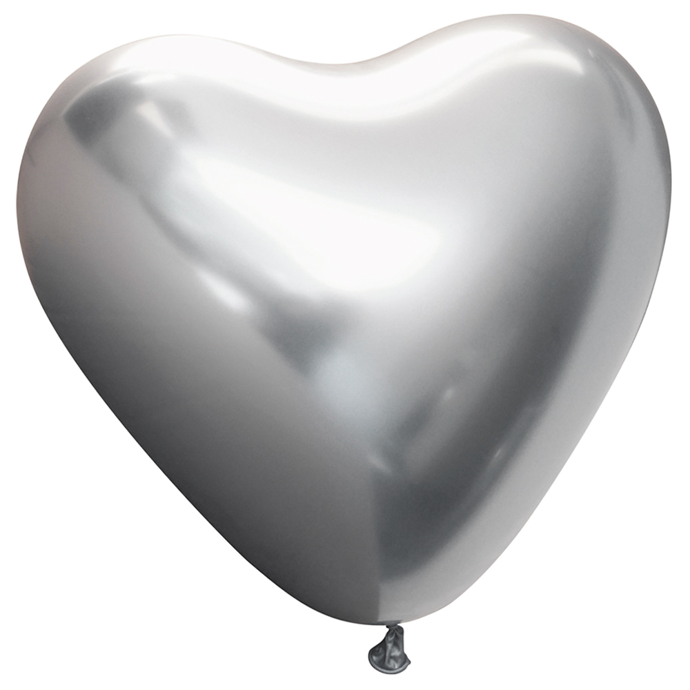 Hjärtballonger Chrome Silver hjärtformade latexballonger i chrome silver som blir ca 30 cm stora. Ballongerna är biologiskt nedbrytbara och fylls med luft eller helium.
