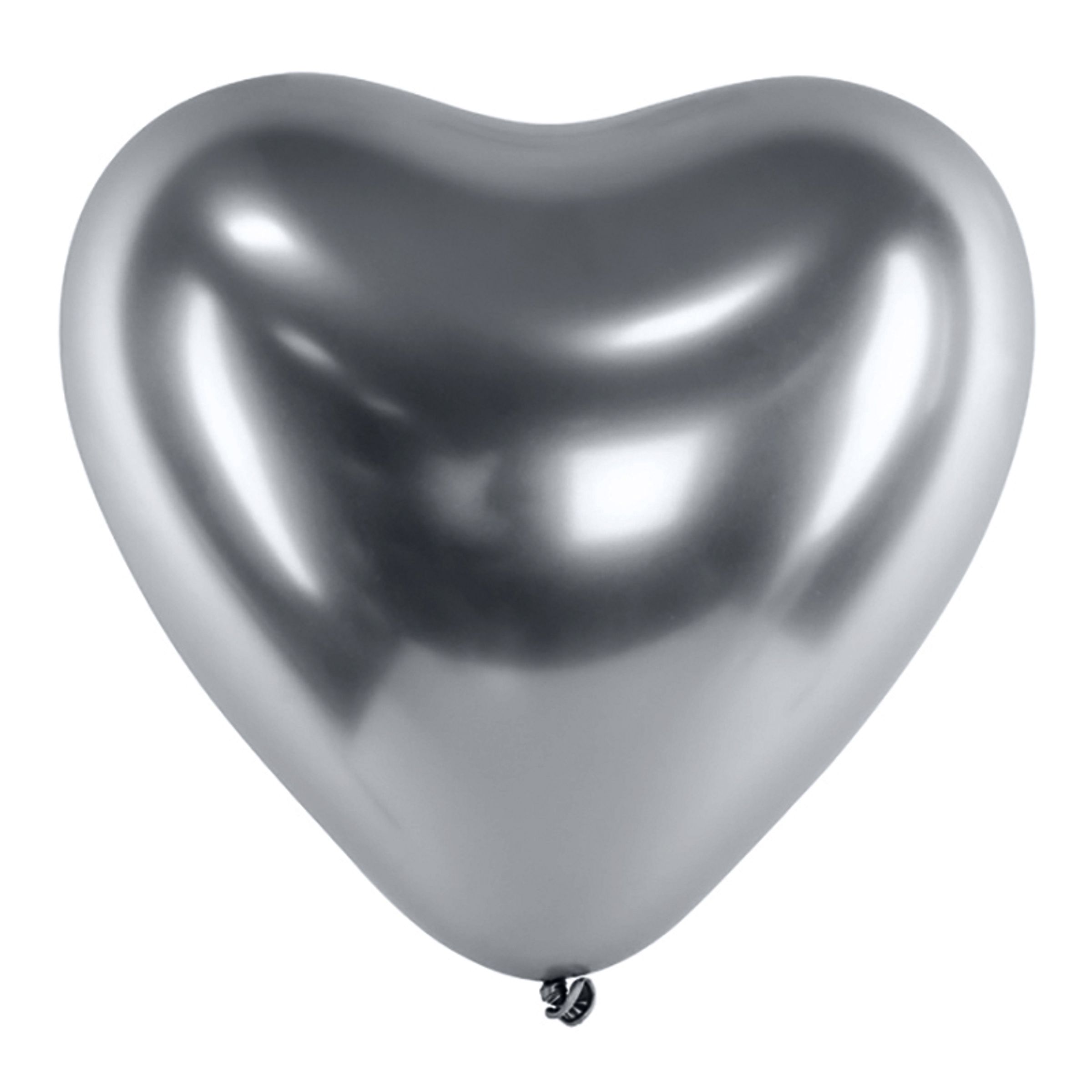 Hjärtballonger Krom SIlver innehåller silvriga latexballonger med hjärtform. Välj mellan 10-, 25-, 50-, eller 100-pack. Ballongerna fylls med luft eller helium. Flygtid med helium är upp till 6 timmar.