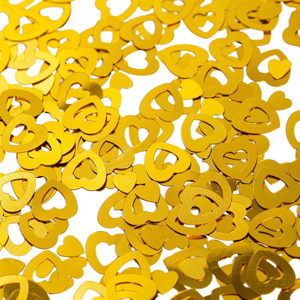 Dekorera med guld-konfetti i form av små hjärtan och få enkelt till en riktigt stämningsfull fest! Det blir enkelt att pynta dukningen med denna hjärtkonfetti nära till hands. Ett toppenbra val för alla som vill addera både en fin nyans av guld och romantiska små hjärtan till firandet.