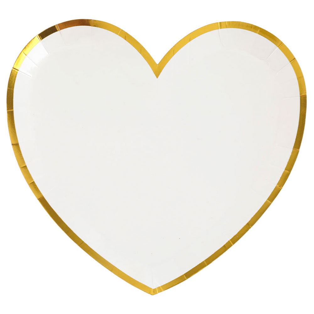 Hjärtformade Tallrikar BB Vit omfattar 10 st vita, hjärtformade engångstallrikar av papp med dekorativa guldkanter. Tallrikarna är ca 20 cm höga och 22 cm breda.