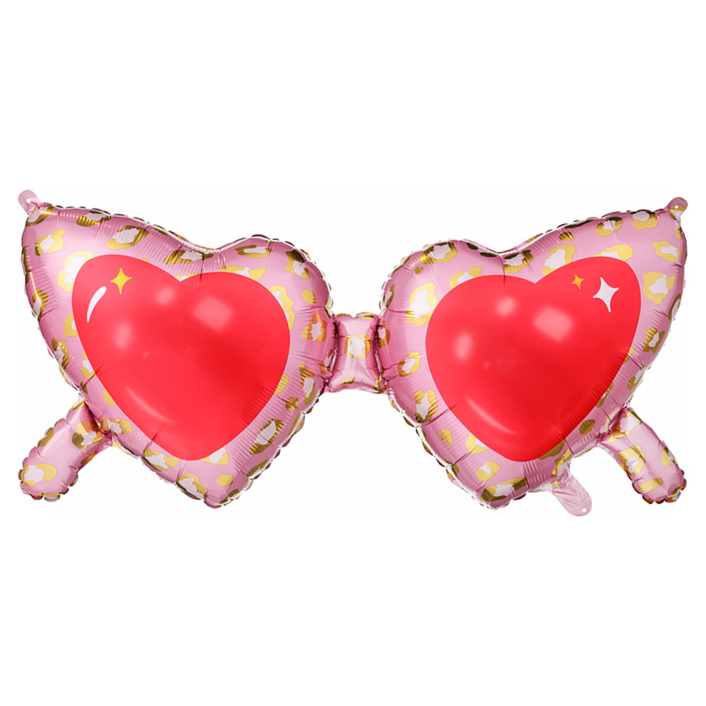 Hjärtglasögon Folieballong omfattar en folieballong i form av ett par rosa-röda hjärtglasögon med leopardmönster i vitt och guld. Ballongen är ca 115 x 52 cm stor och fylls med luft eller helium. Den är även försedd med små öglor för upphängning. Sugrör för enkel uppblåsning medföljer.