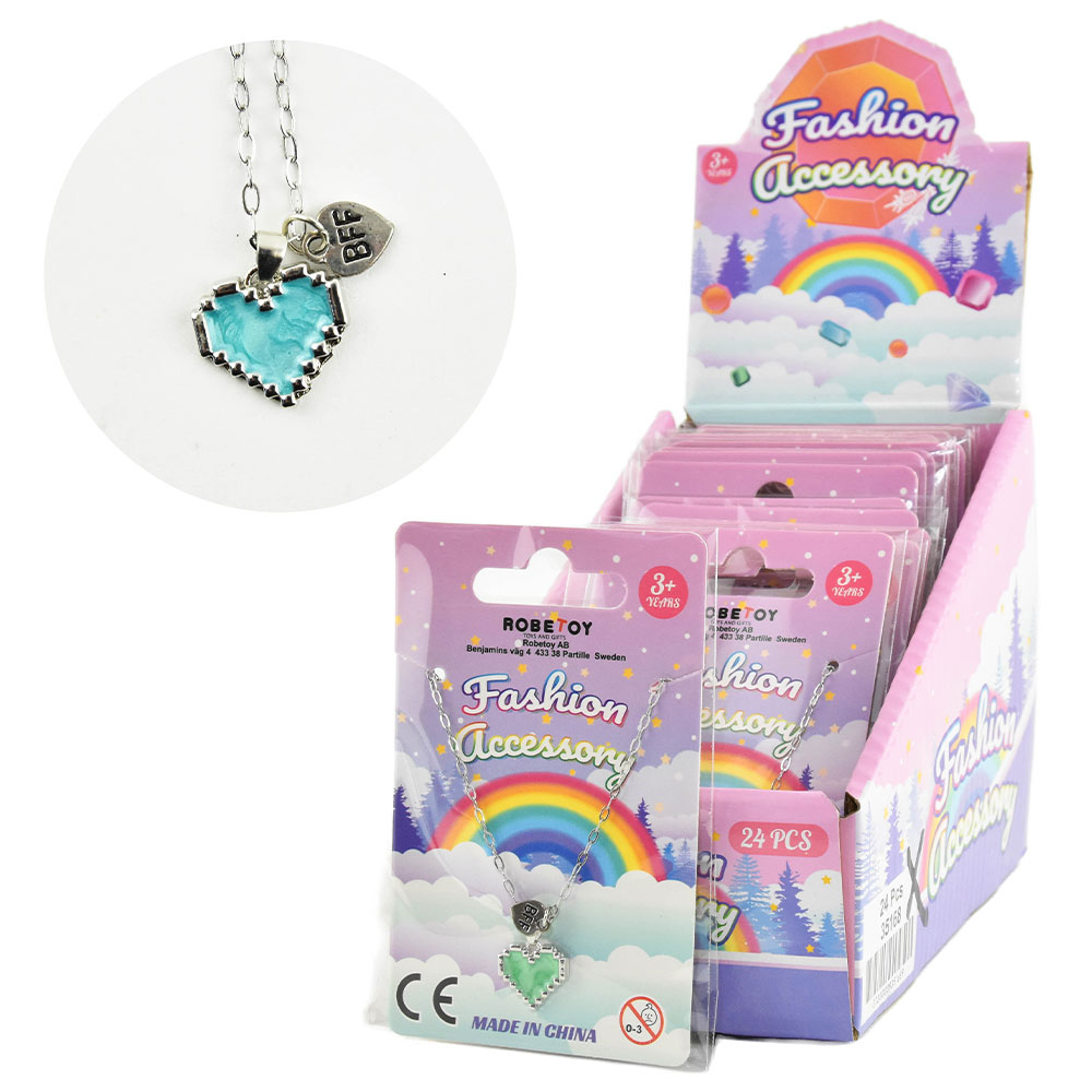 Hjärthalsband omfattar ett halsband med en metallkedja och ett fint hjärta samt ett hjärta med bokstäverna ""BFF"". Halsbandet kommer i färgerna turkos, lila, ljusblå, vit, rosa och svart, vilken du får blir en överraskning.