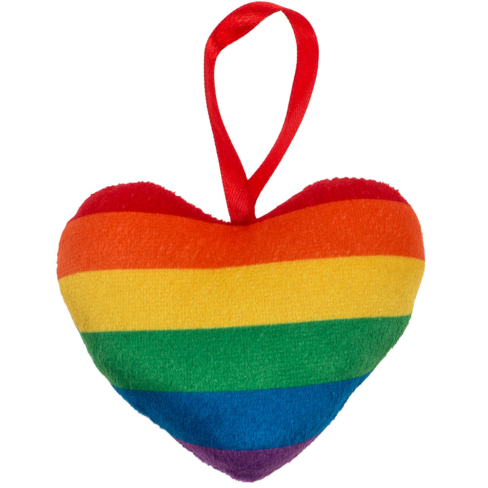 Hjärtkudde Regnbåge Liten omfattar en liten dubbelsidig hjärtformad kudde med ett regnbågsmönster samt ett rött band.