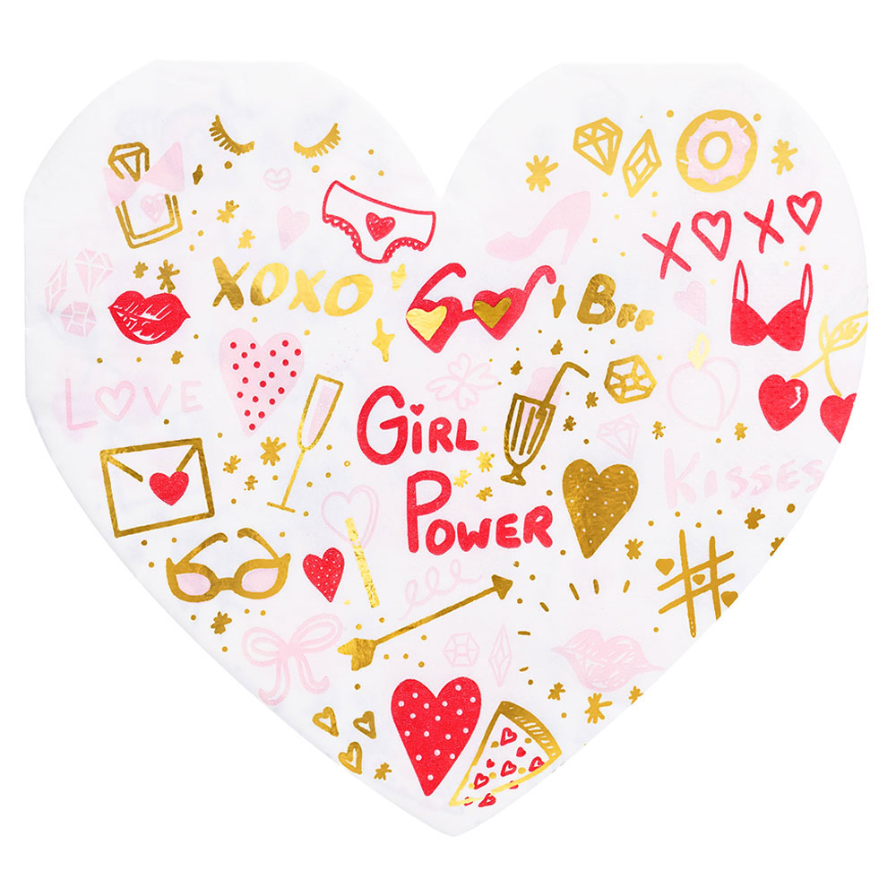 Hjärtservetter Girl Power omfattar vita, hjärtformade servetter med 3 lager som pryds av flera olika texter och motiv i rött, ljusrosa och skimrande guld. Servetterna mäter ca 32 x 32 cm utvikta och kommer i 20-pack.