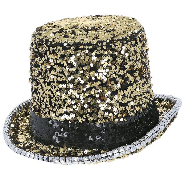 Hög Hatt Filt och Paljetter Guld omfattar en hög hatt som är täckt i svart filt och guld paljetter, ett band med svarta paljetter och en kant med silverfärgade plastnitar. Hatten har ett elastiskt band längst innerkanten för bättre passform.