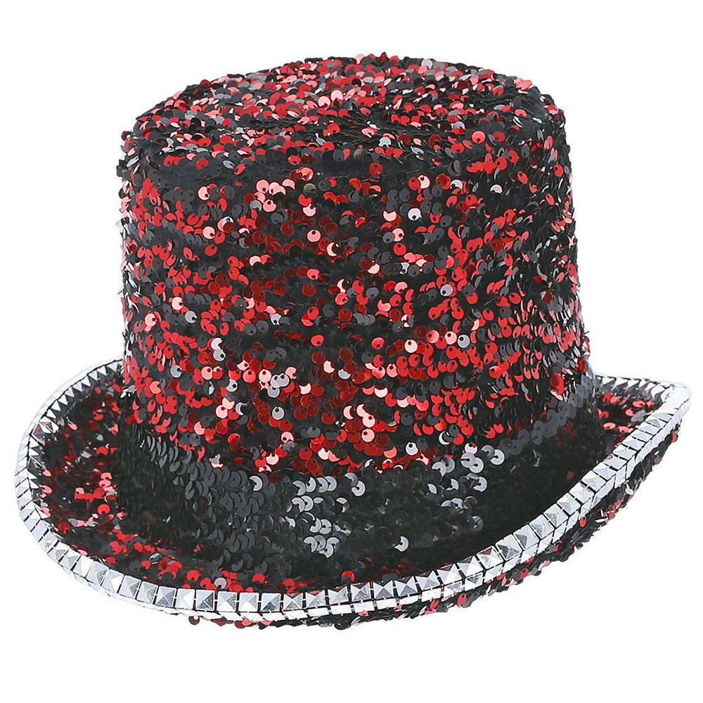 Hög Hatt Filt och Paljetter Röd omfattar en hög hatt som är täckt i svart filt och rödsvarta paljetter, ett band med svarta paljetter och en kant med silverfärgade plastnitar. Hatten har ett elastiskt band längst innerkanten för bättre passform.