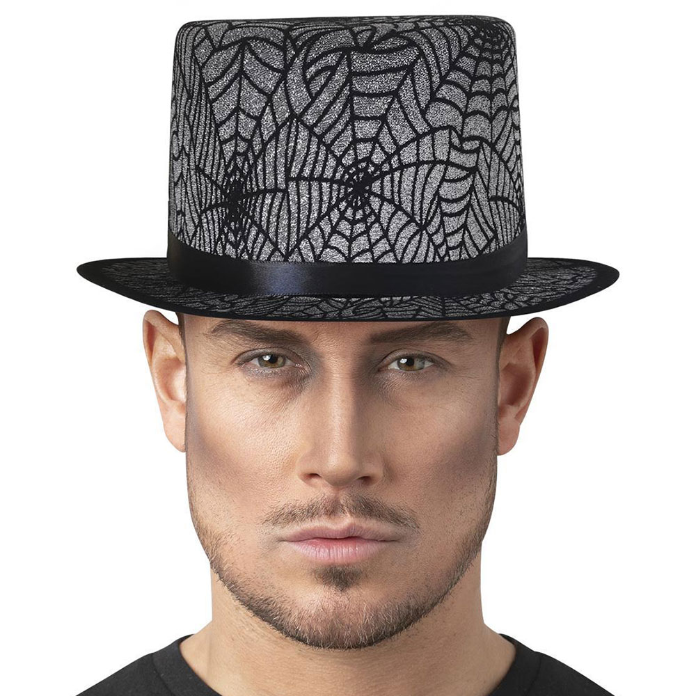 Hög Hatt Spindelnät omfattar en svart och silver hatt med ett spindelnätsmönster och ett svart band.