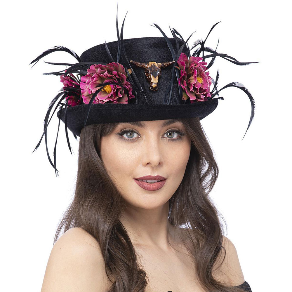 Hög Hatt Svart Blommor och Fjädrar omfattar en svart hög hatt med rosa låtsas pioner, massor av tunna svarta fjädrar och en tjur huvud dekoration längst fram.