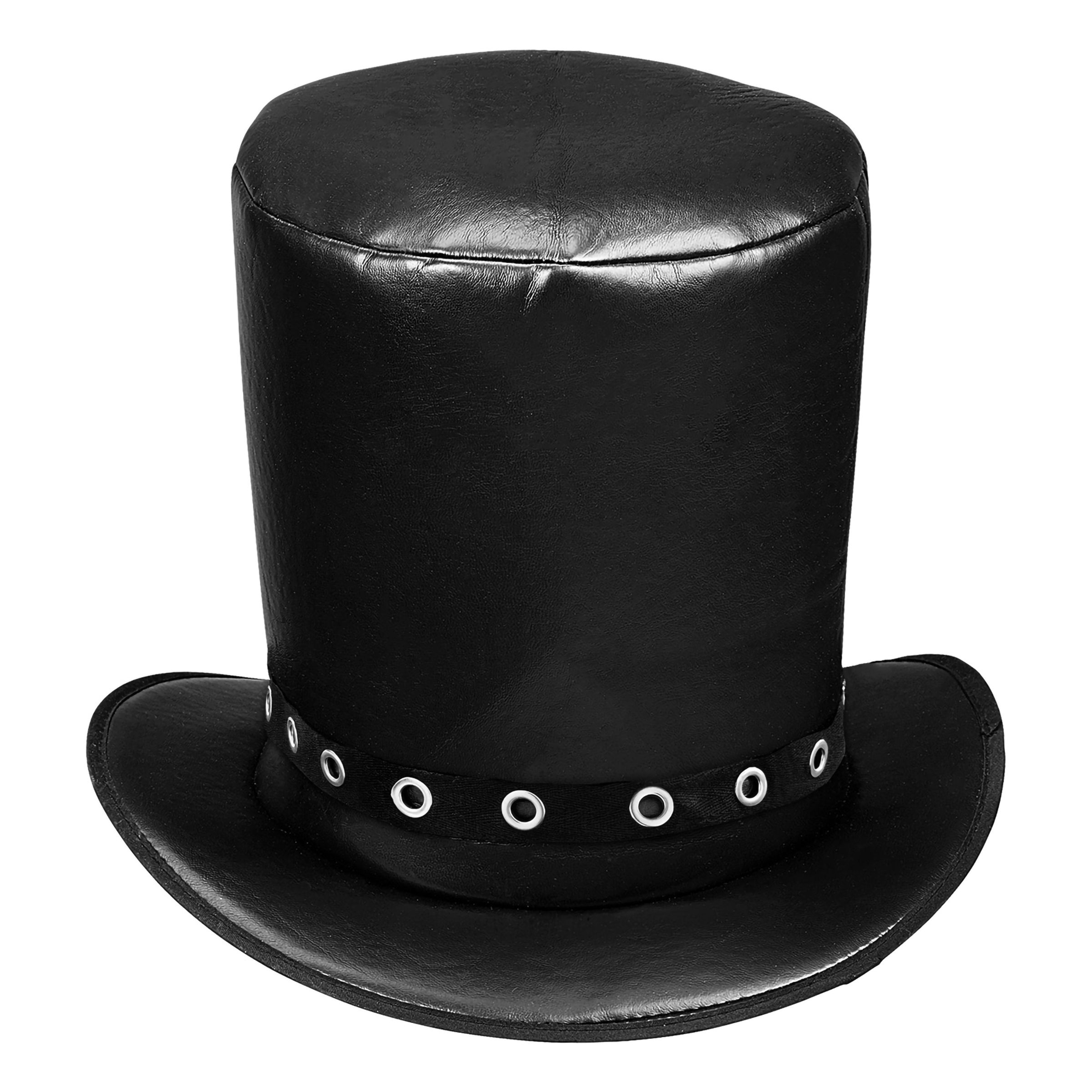 Höghatt i läderlook med extra styv kant och smyckat band runt om. Passar både musikinspirerade maskeradkläder så som halloweenkläder.