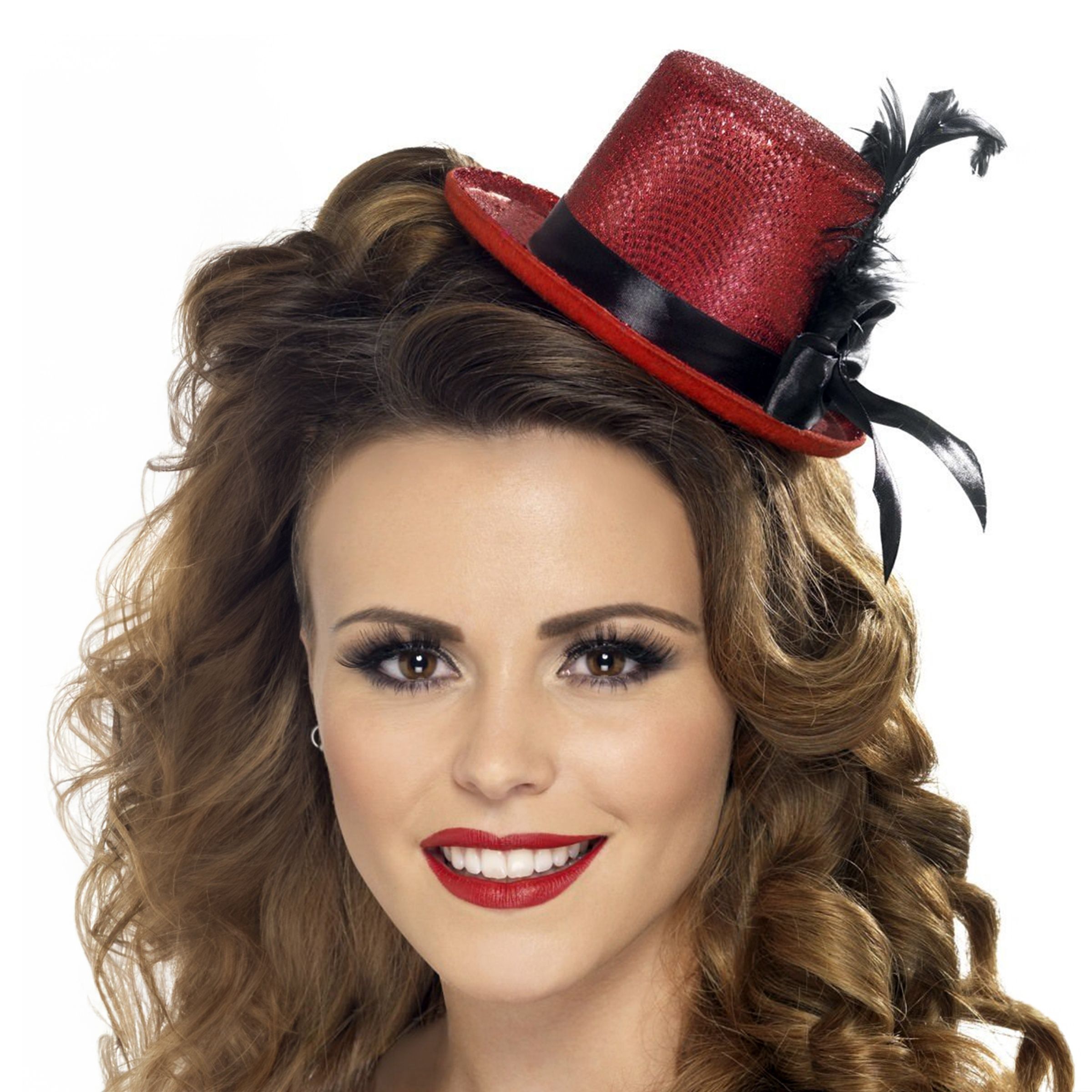 Höghatt Mini Röd är en liten röd hatt i ett material som glittrar och skimrar. Den är tillverkad i ett syntetiskt material. Runt hatten finns ett svart band och på ena sidan finns en svart rosett och några svarta fjädrar.